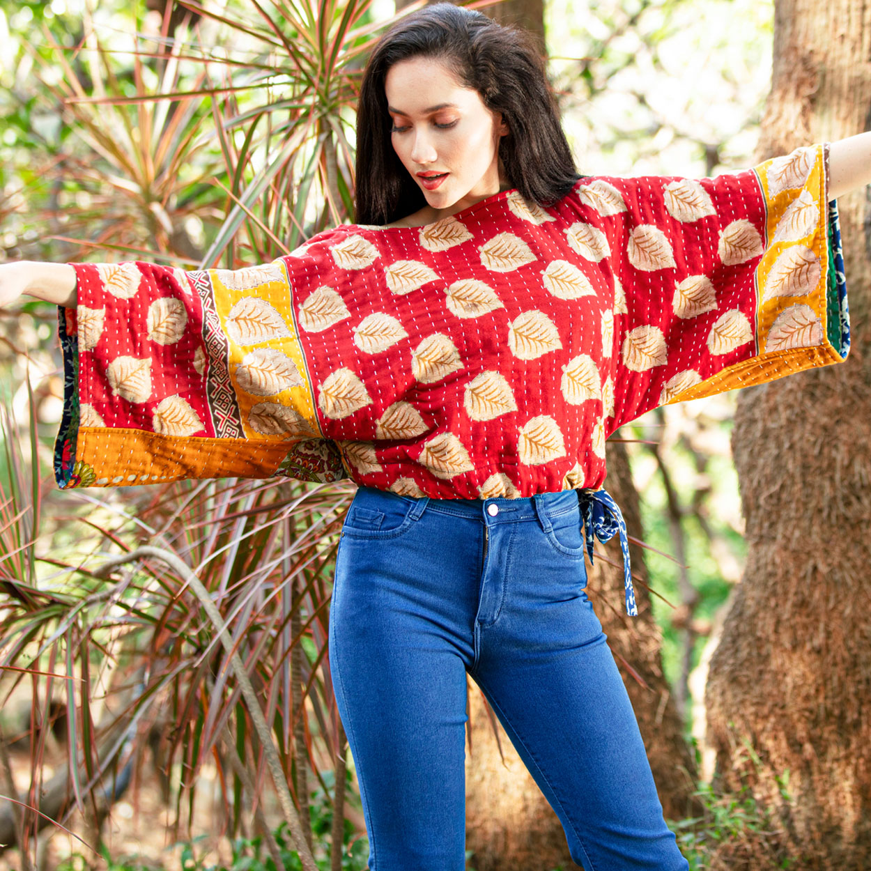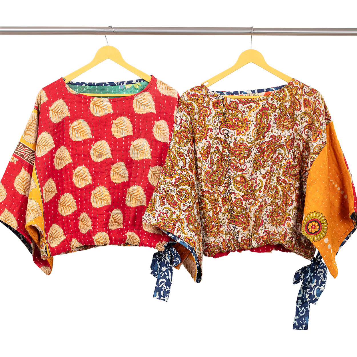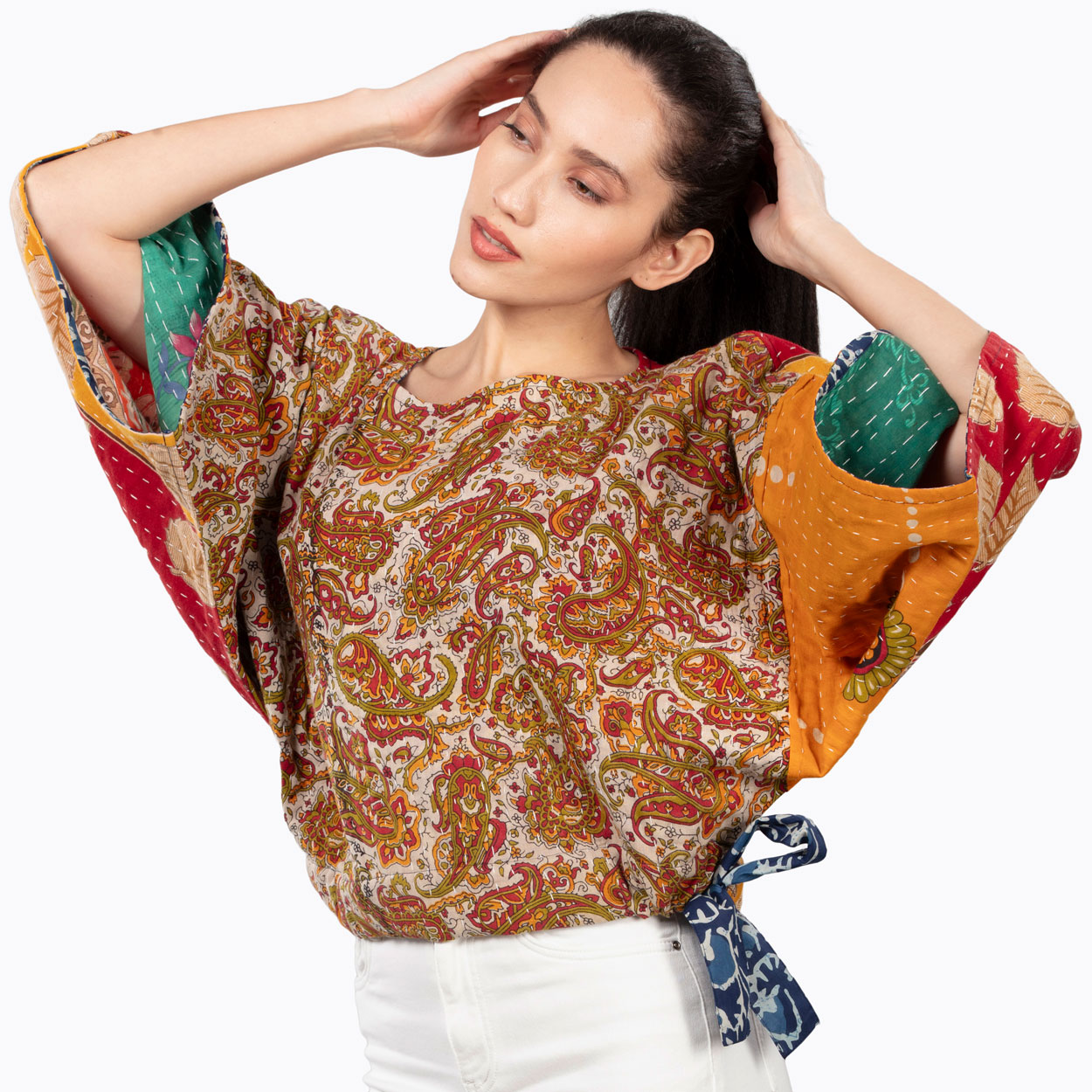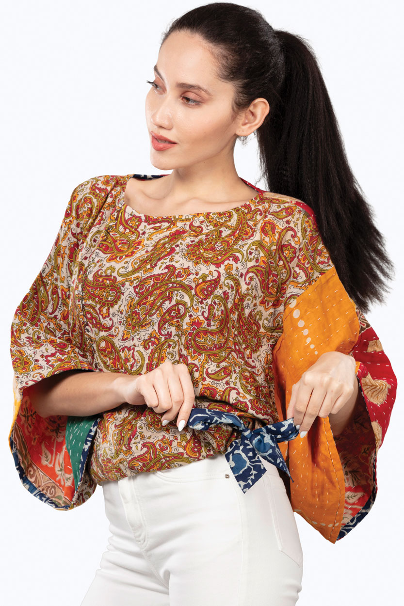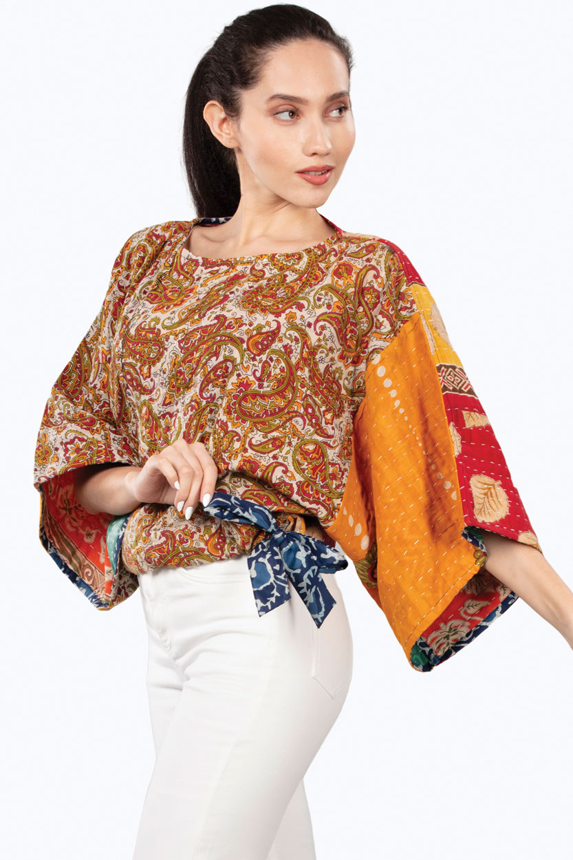Our Reversible Kantha Kimono Crop Top is handmade by women artisans in India using 100% cotton up-cycled saris. Each piece is uniquely beautiful and is made from saris that are intricately stitched together using the traditional “kantha” embroidery technique. Designed in a contemporary cut with an indigo block print trim and tie at the waist, these reversible fair trade crop tops showcase the exquisite kantha craft with unique cotton sari prints on each side.