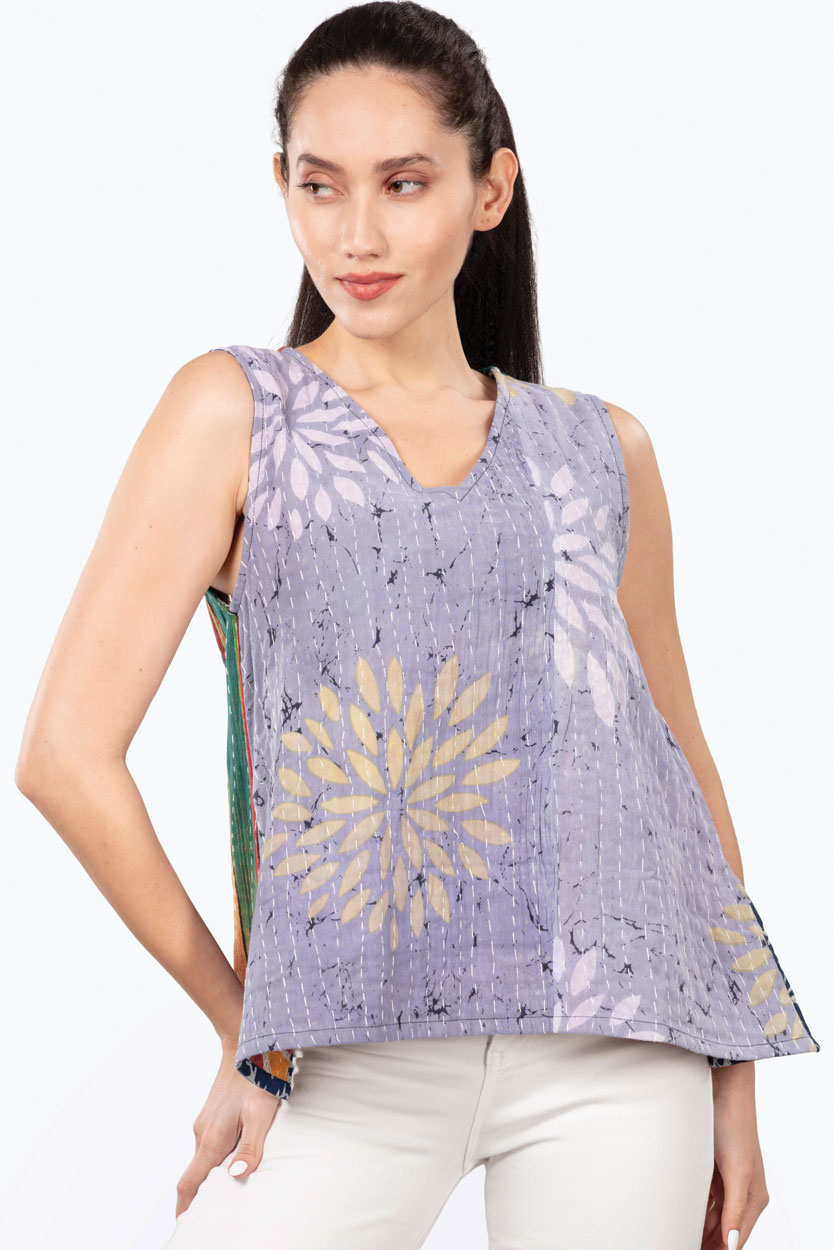 Our Reversible Kantha Sleeveless Top is handmade by women artisans in India using 100% cotton up-cycled saris. Each piece is uniquely beautiful and is made from saris that are intricately stitched together using the traditional “kantha” embroidery technique.  Designed in a contemporary cut with a v-neck, side slits and indigo block print trim, these reversible fair trade tops showcase the exquisite kantha craft with unique cotton sari prints on each side.  Available in two sizes, S/M and L/XL
