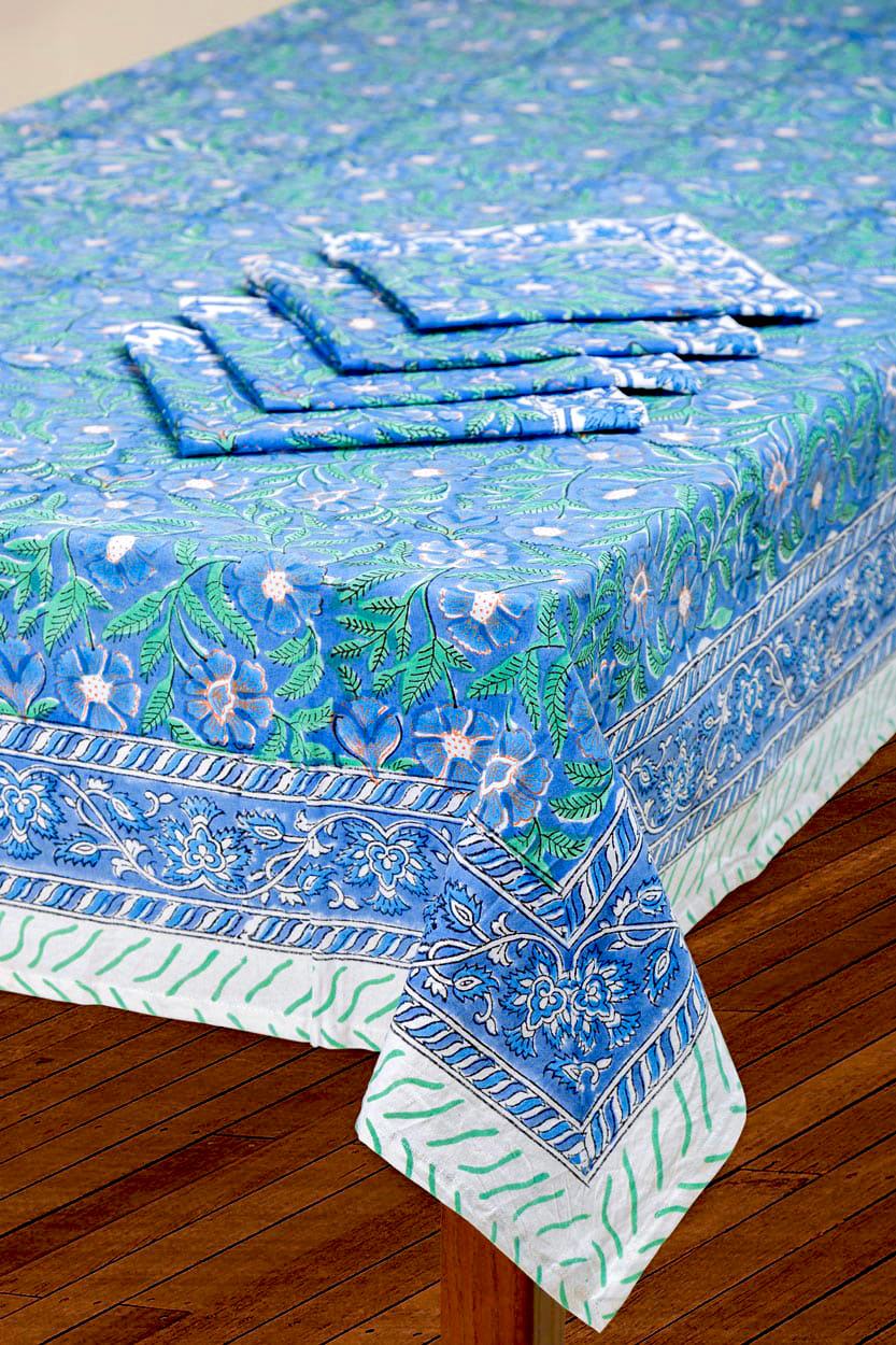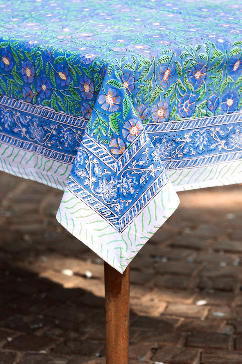 Our Sage & Blue Floral Tablecloth is made with soft 100% cotton and is hand block printed by artisans in Rajasthan, India using hand carved wooden blocks. Great skill and precision is required for the artist to create these fine hand block prints, and the natural variations that occur with hand block printed textiles adds to the authentic beauty of each piece. These fair trade tablecloths can also be used as a twin bedspread and have matching napkin sets, placemats, and table runners. Our cotton table linens are machine washable and showcase the beautiful block printing traditions of India with eco-friendly dyes.