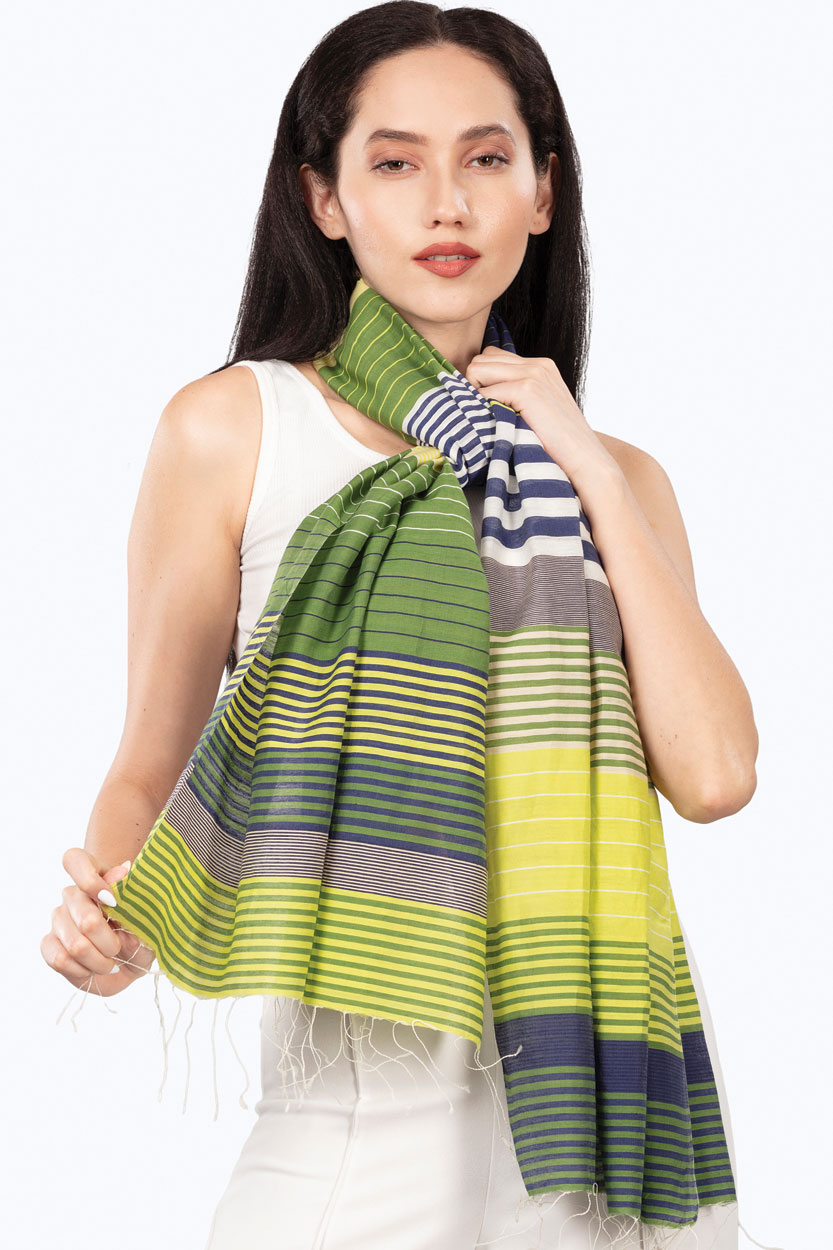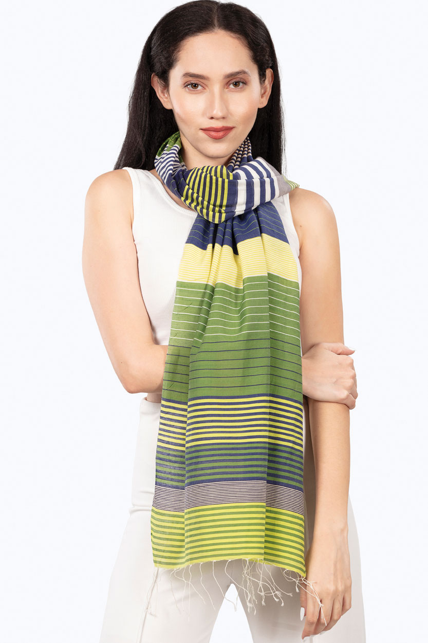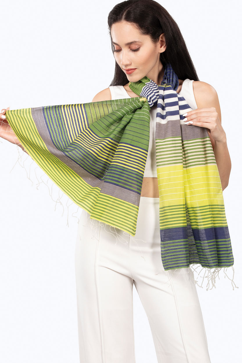 Our Samita Stripes Scarf is hand-woven with fine cotton and silk in a stunning stripes weave. One of our most popular fair trade scarves, this design features a beautiful color combination of navy, lime green, and silver. Lightweight but also generous in size, this navy striped scarf can be worn around the neck or over the shoulders.
