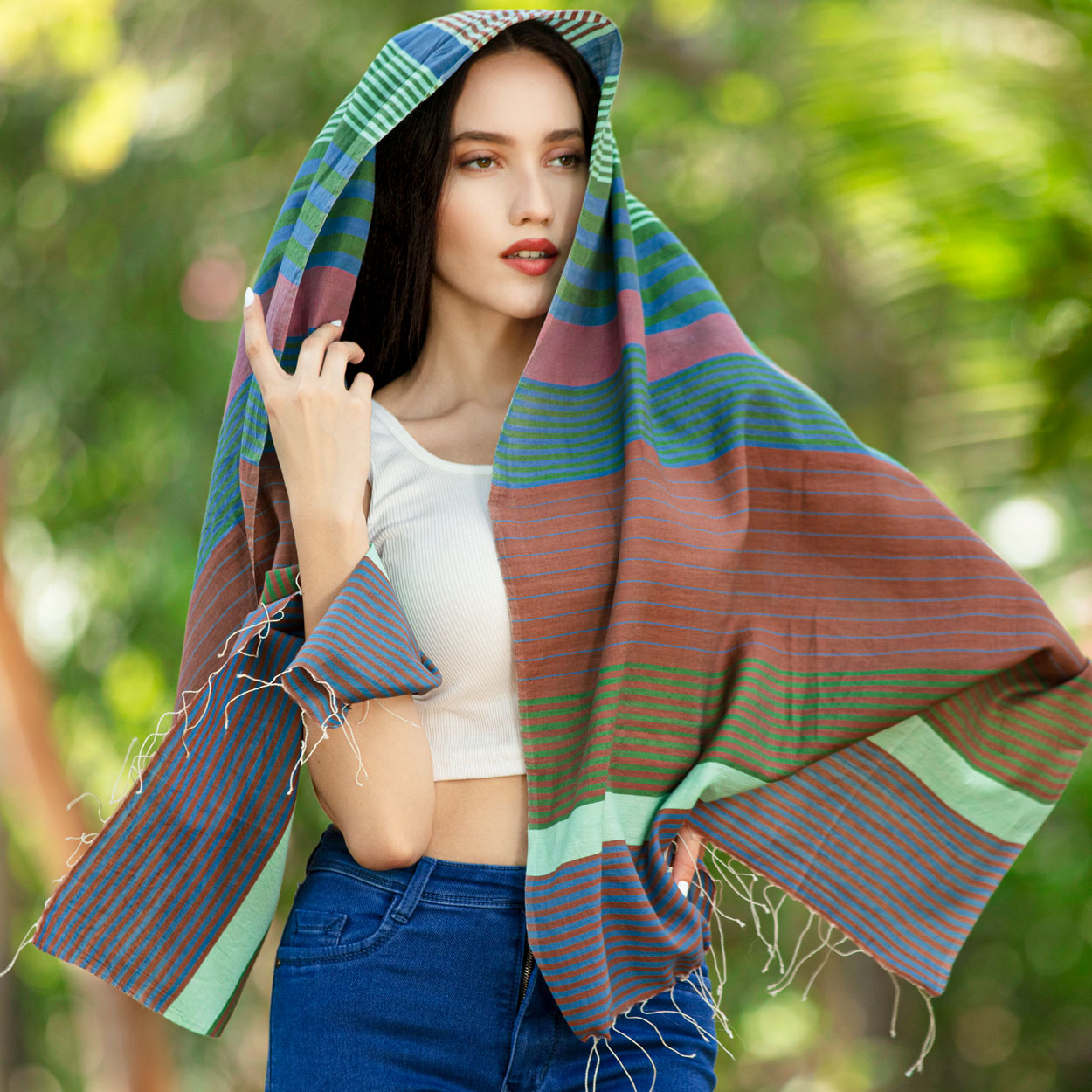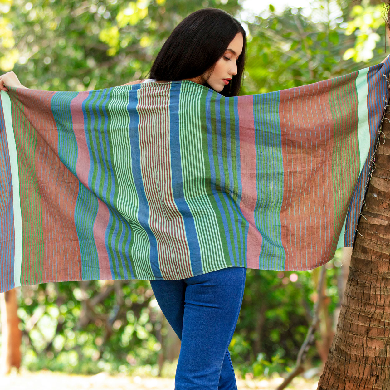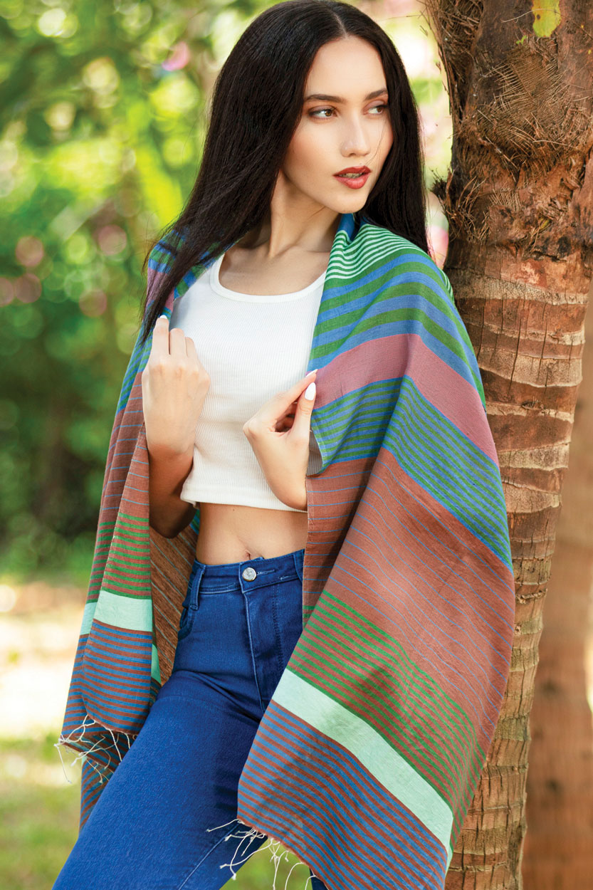 Our Samita Striped Scarf is hand-woven with fine cotton and silk in a stunning stripes weave. One of our most popular fair trade scarves, this design features a cheerful color combination of rose, blue, green and brown. Lightweight but also generous in size, this fair trade scarf can be worn around the neck or over the shoulders.
